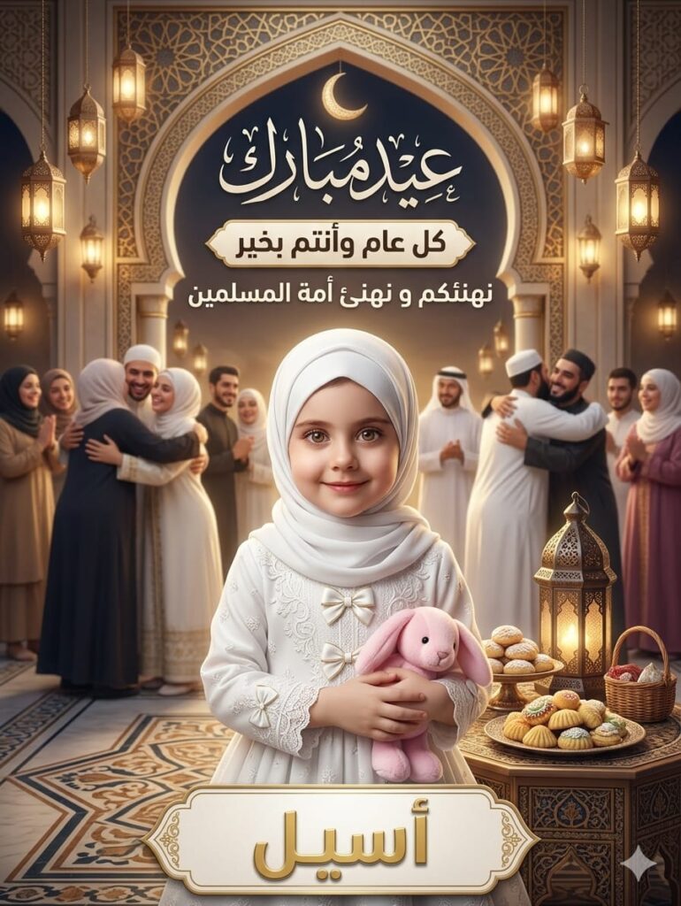 Text (Optional): “Eid Said Ya Helwa” or “Asakum Min Awadah” written in a playful, childlike Arabic font.