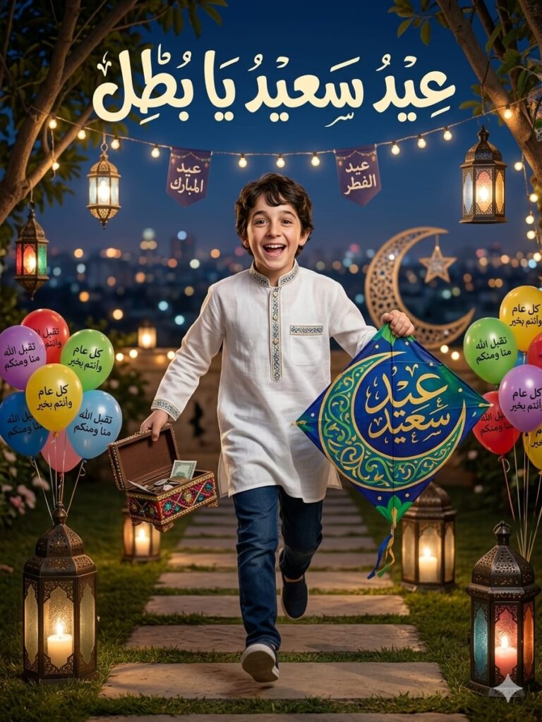 Running cheerfully in a park decorated with Eid decorations, or standing amidst a collection of colorful balloons carrying Eid congratulatory phrases in Arabic.