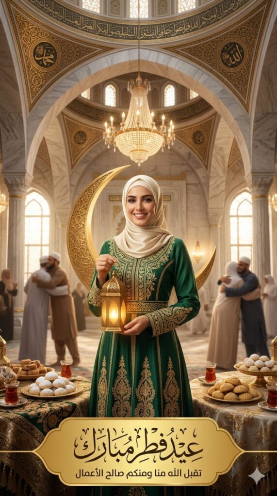 A high-end cinematic luxury Eid Al-Fitr poster featuring a beautiful woman with facial features resembling the reference, wearing a modest elegant green traditional dress with intricate gold embroidery and a cream-colored hijab. She is smiling warmly and holding a traditional glowing lantern. The setting is inside a magnificent mosque with grand marble arches, golden geometric patterns on the ceiling, and a large crystal chandelier. In the background, people are happily greeting each other, creating a joyful festive atmosphere. A large golden crescent moon stands behind her. In the foreground, there are tables with plates of traditional Eid sweets like Kahk and Maamoul. At the bottom, a luxurious gold banner features elegant Arabic calligraphy that reads ‘Eid Fitr Mubarak’ and ‘May Allah accept from us and from you’. The lighting is warm and dramatic, 8k resolution, ultra-realistic, professional advertising photography.”