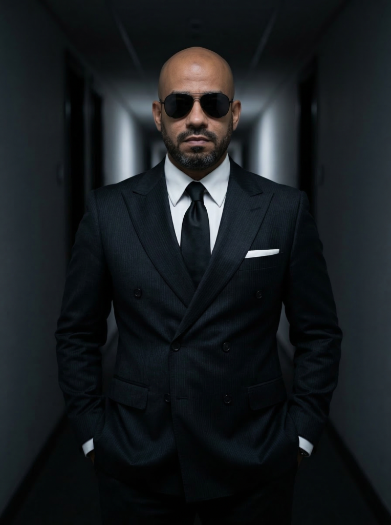 A high-resolution, perfectly symmetric portrait photograph of a man with [INSÈRE TON VISAGE ICI] standing centrally in a dimly lit, narrow, perspective-driven modern corridor. He is wearing the exact same attire as in image_0.png: a meticulously tailored dark charcoal-to-black double-breasted suit with subtle pinstripes, a crisp white dress shirt with a stiff collar, and a matte black silk tie. He wears dark aviator sunglasses and has a well-groomed short beard. His pose is frontal and commanding, with both hands placed deep in his trouser pockets. A white pocket square is neatly folded in the breast pocket, and a detailed, heavy-link silver wristwatch is visible on his left wrist. The lighting is dramatic and low-key, creating deep shadows (chiaroscuro) that contour his face and suit, with a subtle light source further down the corridor to create depth. The background is a dark, out-of-focus receding hallway with textured walls. The entire composition is centered and authoritative. P