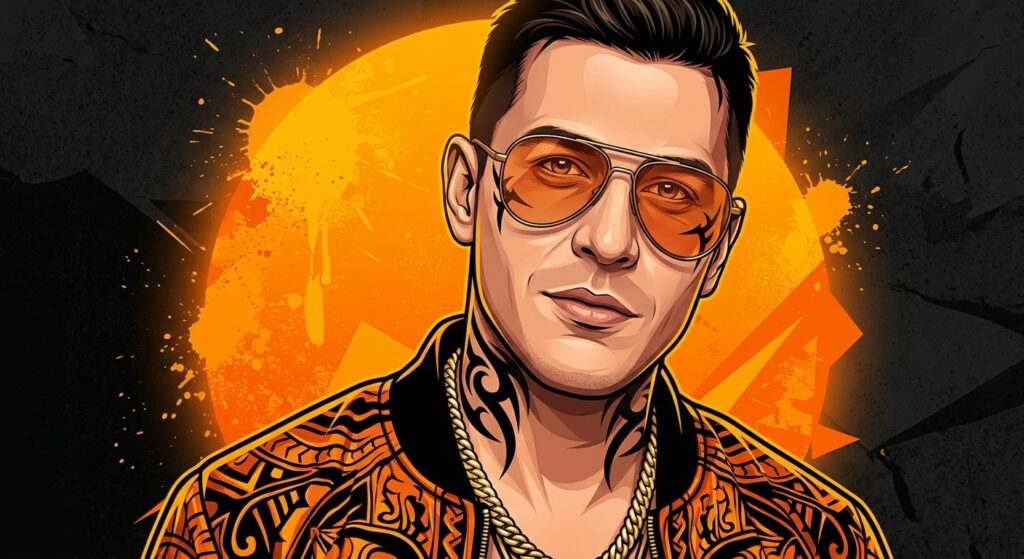Vector art illustration of a charismatic man his facial features typically as the attached photo . He is wearing vintage aviator sunglasses with translucent orange-tinted lenses. The character has bold black tribal tattoos on his neck and near his eyes. He is dressed in an intricate orange patterned jacket and a thick gold chain necklace. The background features a large, glowing orange sun with artistic paint splatters and a textured dark grey backdrop. High contrast, sharp lines, cinematic lighting, vibrant orange and black color palette, urban streetwear aesthetic, 2D flat design with detailed shading.